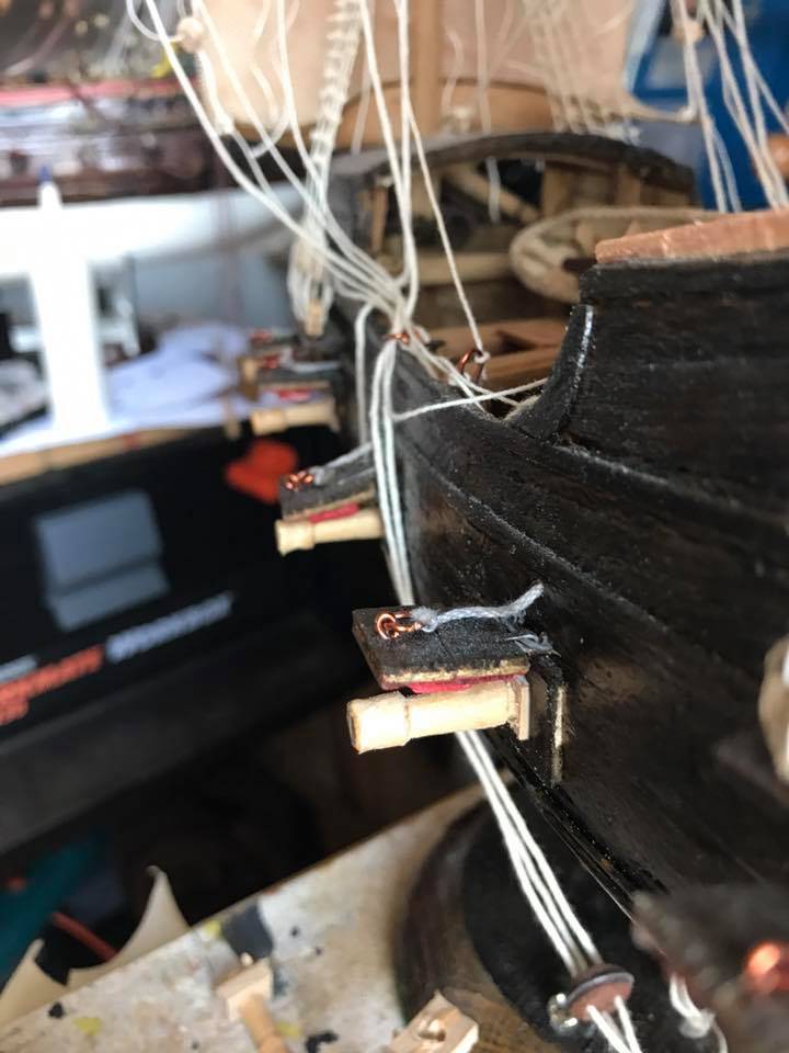 De voortgang van dit schip,de 1e mast geplaatst en de mars en nu de wanten aan het knopen.